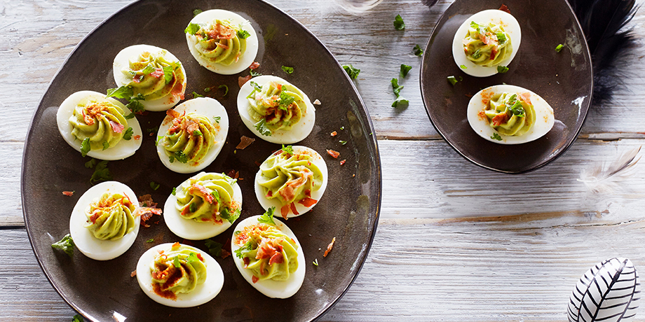 5. Leg de halve eieren op een schaal met de snijkant naar boven. Schep de vulling in een spuitzak en vul de eieren ermee of schep met een theelepel het mengsel in de eieren. Bestuif met een snufje cayennepeper.