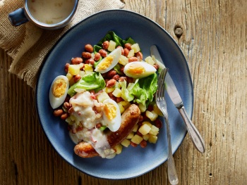 Neem in plaats van kropsla 75 gram gemengde bladsla voor dit recept.Vervang de saucijsjes door speklappen.
